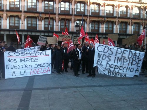Algo más de 70 trabajadores de las empresas de autobuses Rubicar y AUT se han manifestado en Toledo para reclamar el pago de sus nóminas por parte de la empresa (que asegura no poder hacer frente a los pagos por llevar desde el mes de agosto sin cobrar las facturas que adeuda la Junta de Castilla La Mancha) y en protesta de la imposición de unos servicios mínimos del 100% en el servicio de transporte escolar contratado con el Gobierno regional.
